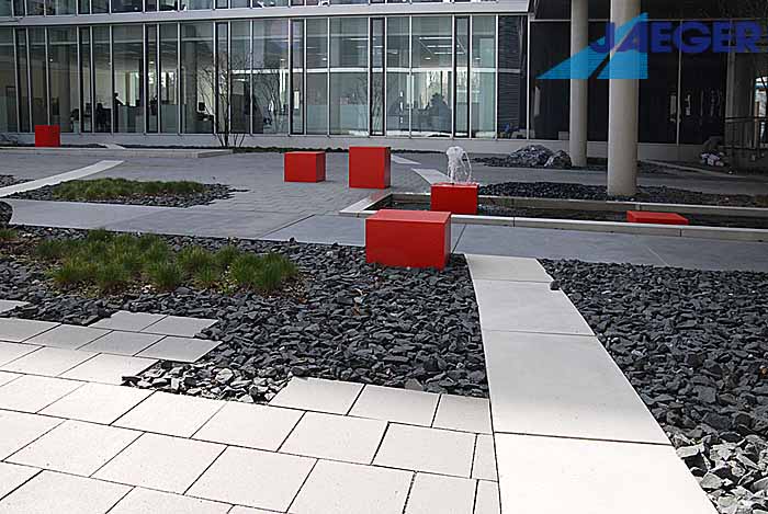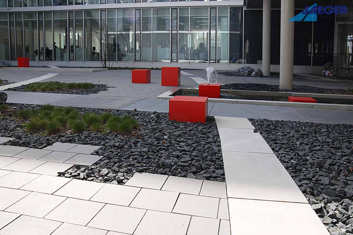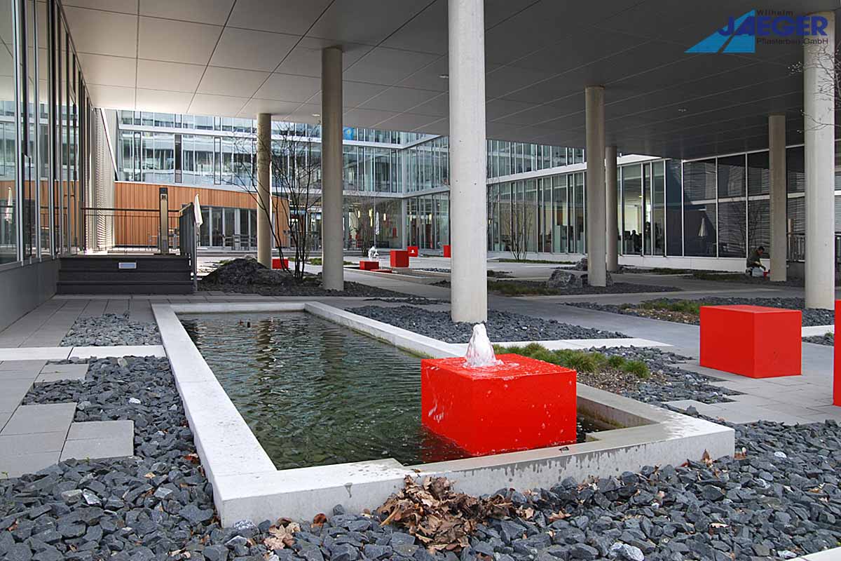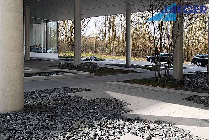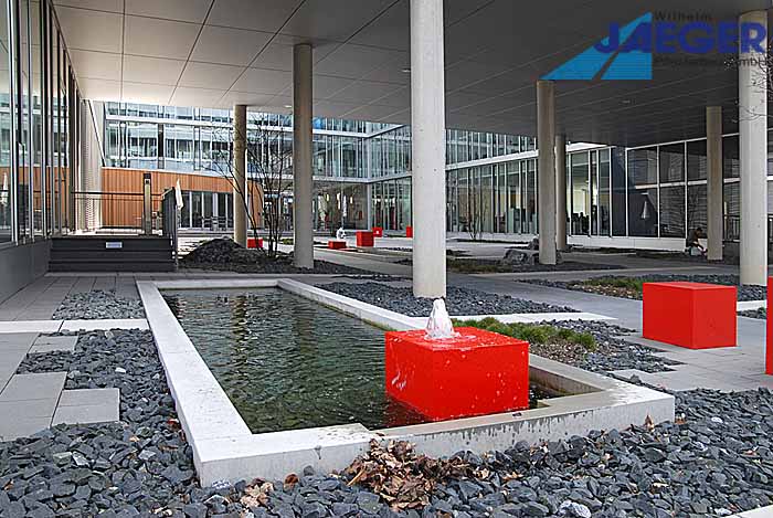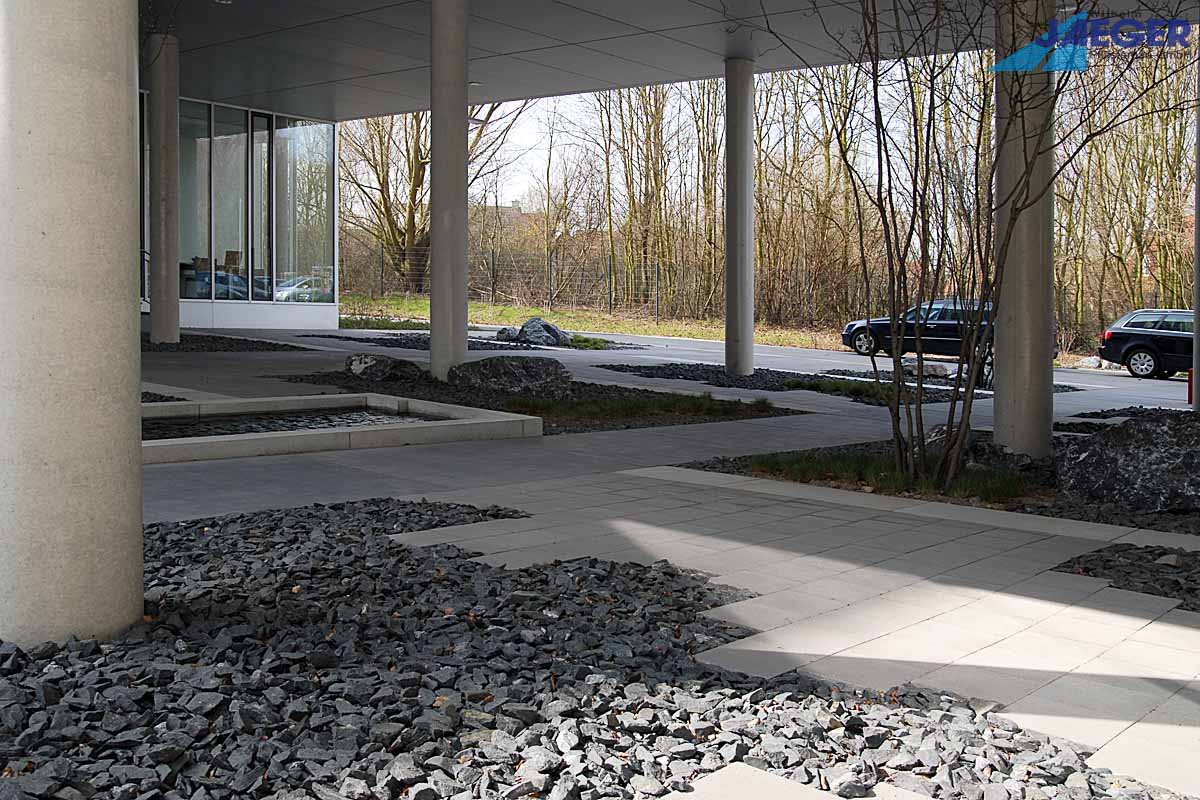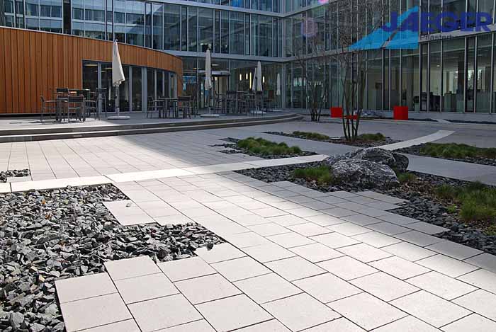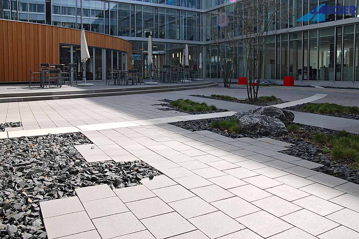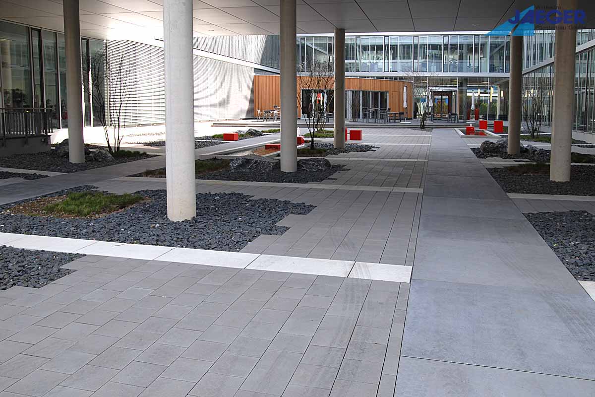 Die Hauptniederlassung der amerikanischen Aktiengesellschaft hat den bis dahin schönsten Innenhof den wir mit gestalten durften. Mit rund 200 qm Großformatplatten 1,0 x 1,0 m sowie 2.000 qm Betonpflaster verschiedener Formate nicht besonders groß, dafür gestalterisch besonders wertvoll.